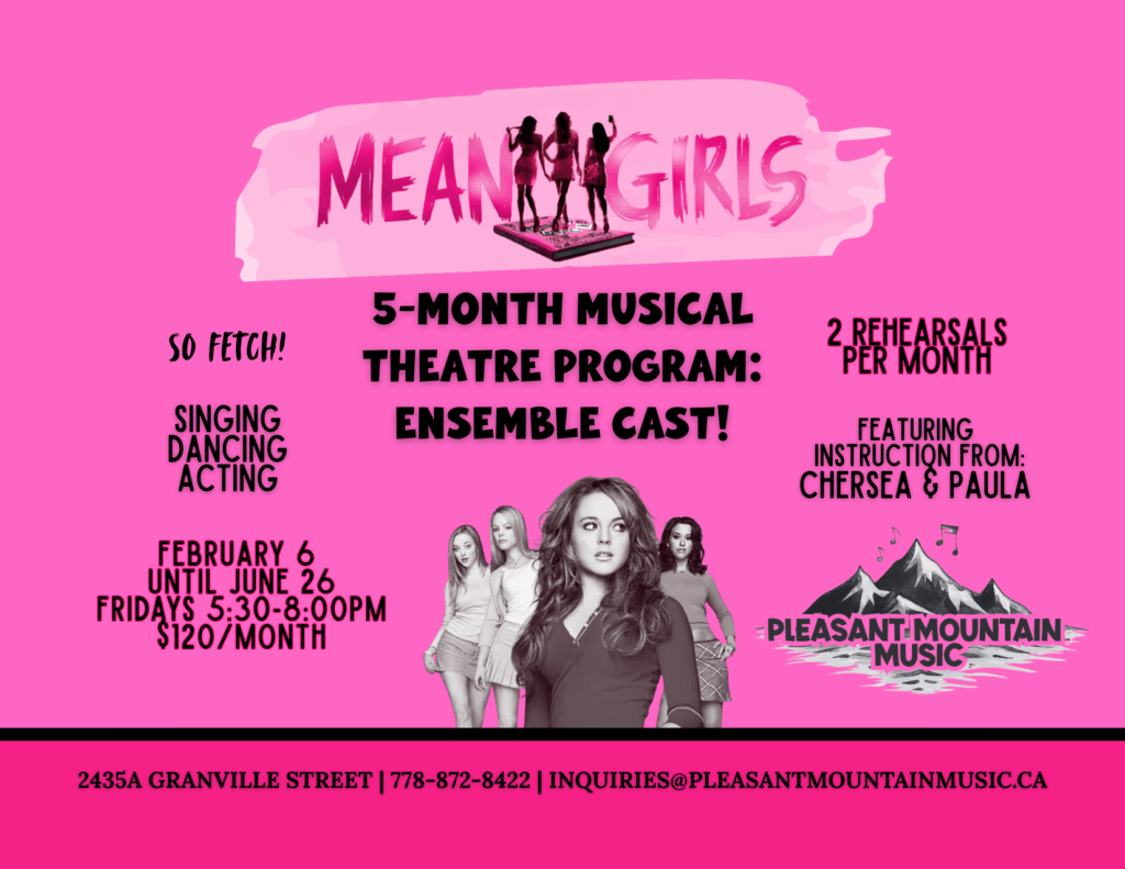 Pleasant Mountain Music is absolutely delighted to be bringing back our Musical Theatre Ensemble! This year we will be performing Mean Girls the Musical Jr Edition. Our ensemble will start in November 2025 and end with performances at the Gateway Theatre in June 2026